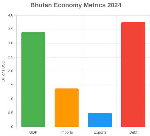 | Imports 2024 | $1.38 B | Tops fuel and machinery; gap widens deficit. Local solar cuts 15% energy pull, easing Bhutan economy challenges 2024 like price spikes. |