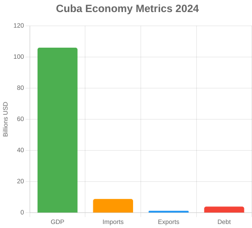 The Cuba economy grapples with persistent headwinds in 2024, marked by a $106 billion GDP and a -1.1% contraction, as reported by the Cuban Ministry of Economy and independent sources like The Economist. With a Cuba population of 9.75 million, the Cuba GDP per capita stands at $7,433, down from pre-crisis levels, reflecting the strain of U.S. sanctions, energy shortages, and inflation hovering around 24%. What is the economy of Cuba? A centrally planned system dominated by state control, where Cuba economy type is a command economy focused on services and tourism, though agriculture and biotech play roles. Cuba economy 2024 saw imports at $8.9 billion, exports at $1.3 billion, and debt at $4 billion, with gold reserves at 11.24 tons providing a buffer—no silver reserves noted. Cuba economy news today highlights power outages and migration waves, but Cuba economy 2025 eyes 1.4% growth via reforms, tourism revival, and Russian/Chinese ties, per IMF projections. The Cuba economy overview reveals resilience amid the crisis, with remittances and medical exports offering lifelines in the Cuba economy crisis.