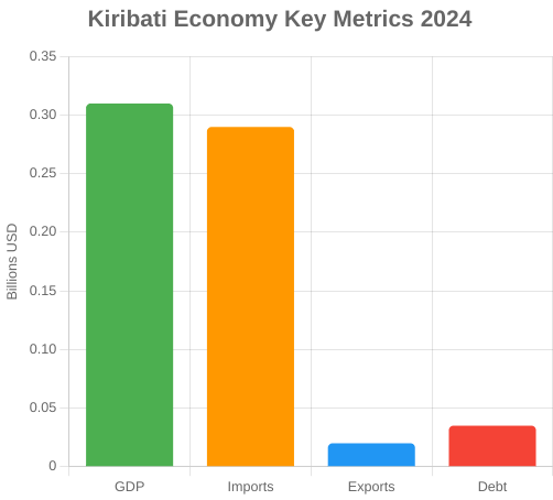 | Debt 2024 | $0.035 B | Just 11% of GDP—very safe. No big loans needed. Kiribati economy use: Borrow $20 M for solar panels. |