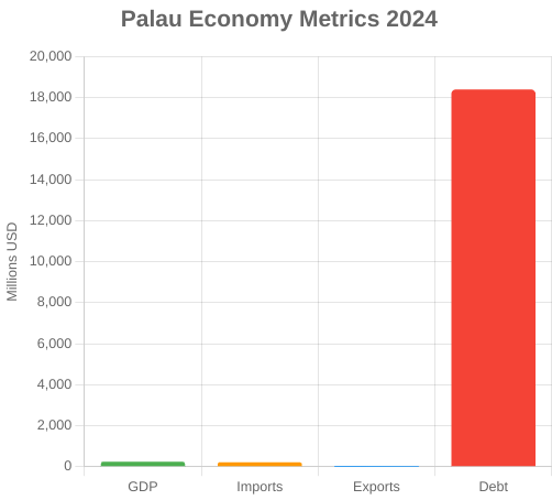 GDP 2024$242 MTotal from tourism (40%), construction (20%), aid (30%). Up from $225 M in 2023; supports free health for 18,000. Palau economy overview: Aid buffers shocks; tip: Eco-hotels add $20 M in 2025.
