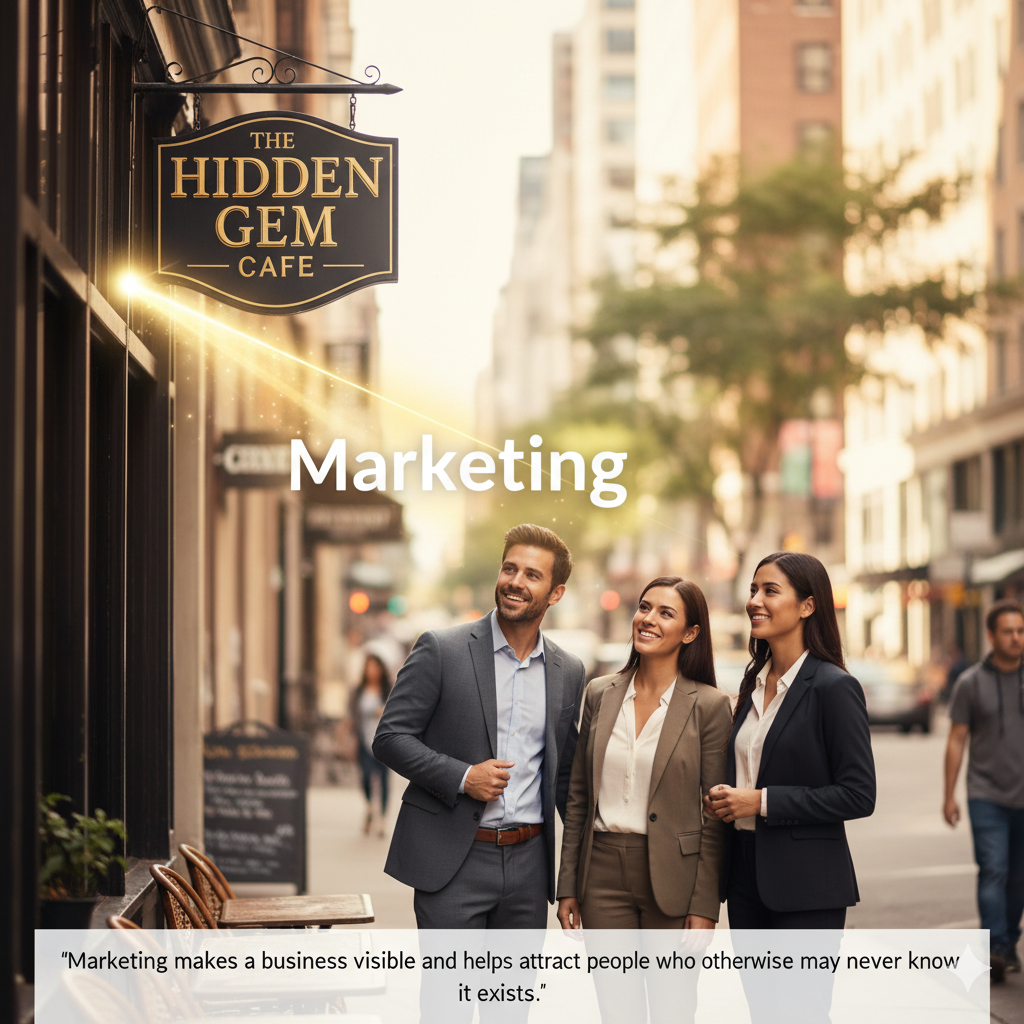 Because without marketing, nobody even knows the business exists. You could have the best product in town but if people don’t hear about it they won’t buy it. Marketing gives visibility.